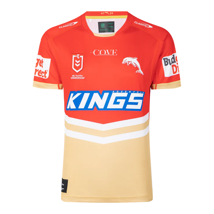 Stand out in the crowd with the Dolphins 2023 Home Jersey. This 100% Polyester Sublimated jersey is more than just team apparel; it’s a symbol of your loyalty and support. Made with Stay Cool Tech fabric, it ensures you stay comfortable even during intense games. The jersey features a rib collar and cover stitch seams for an extra layer of comfort. The bound hem and sleeves, embroidered chest club & NRL logo, and printed sponsors add a touch of authenticity, while the anti-microbial and wickable finish keeps you fresh. Wear it with pride and let your support for the Dolphins shine.