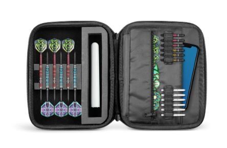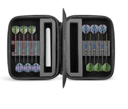The tough supersized 23×18 cm Mega Tactical Dart Case carries and protects four sets of fully assembled darts without crushing flights, ready for play. But that’s just the start. A quality zip closure opens the case like a clamshell. The dual-sided inner sleeve with multiple storage compartments provides generous storage for flights, shafts, and accessories. Use the full-depth zipped pocket for secure phone storage on one side; a large pocket on the other is useful for personal items like cards and keys. The portable Mega Tactical case has a quality nylon handle and metal d ring for clipping on extras-whatever you need for the competition.