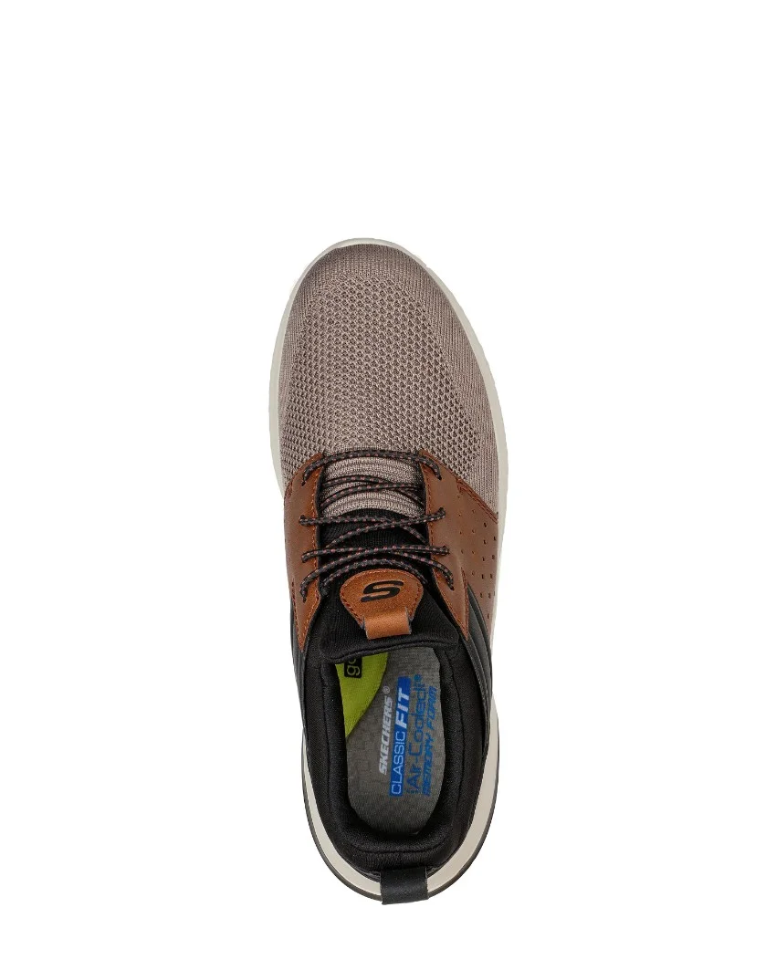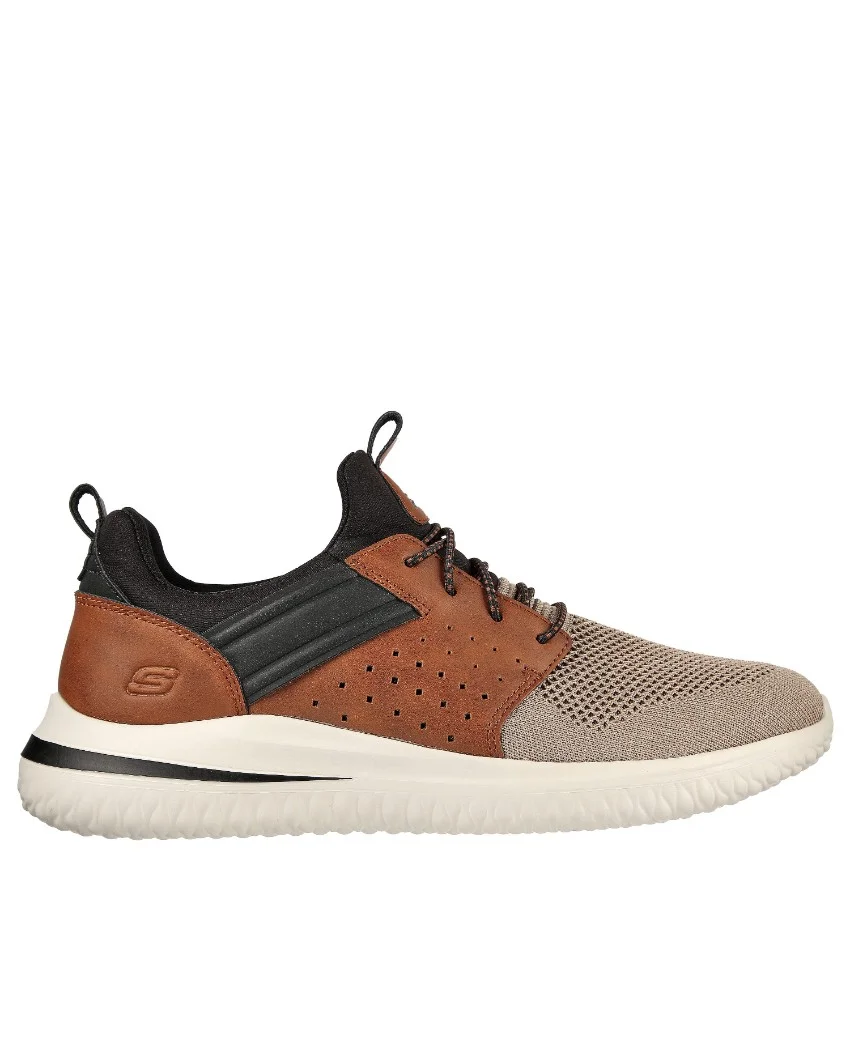 Shop the Mens Skechers Delson Cicada- A favorite versatile style gets even more comfortable in the Skechers Delson 3.0 – Cicada shoe. This slip-on oxford sneaker features a lightweight mesh knit and smooth synthetic upper with a stretch-laced front and a cushioned Skechers Air-Cooled Memory FoamĀ® insole.