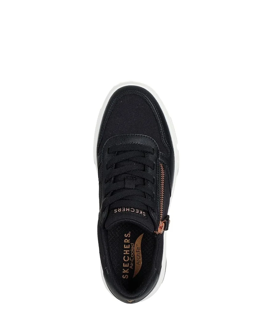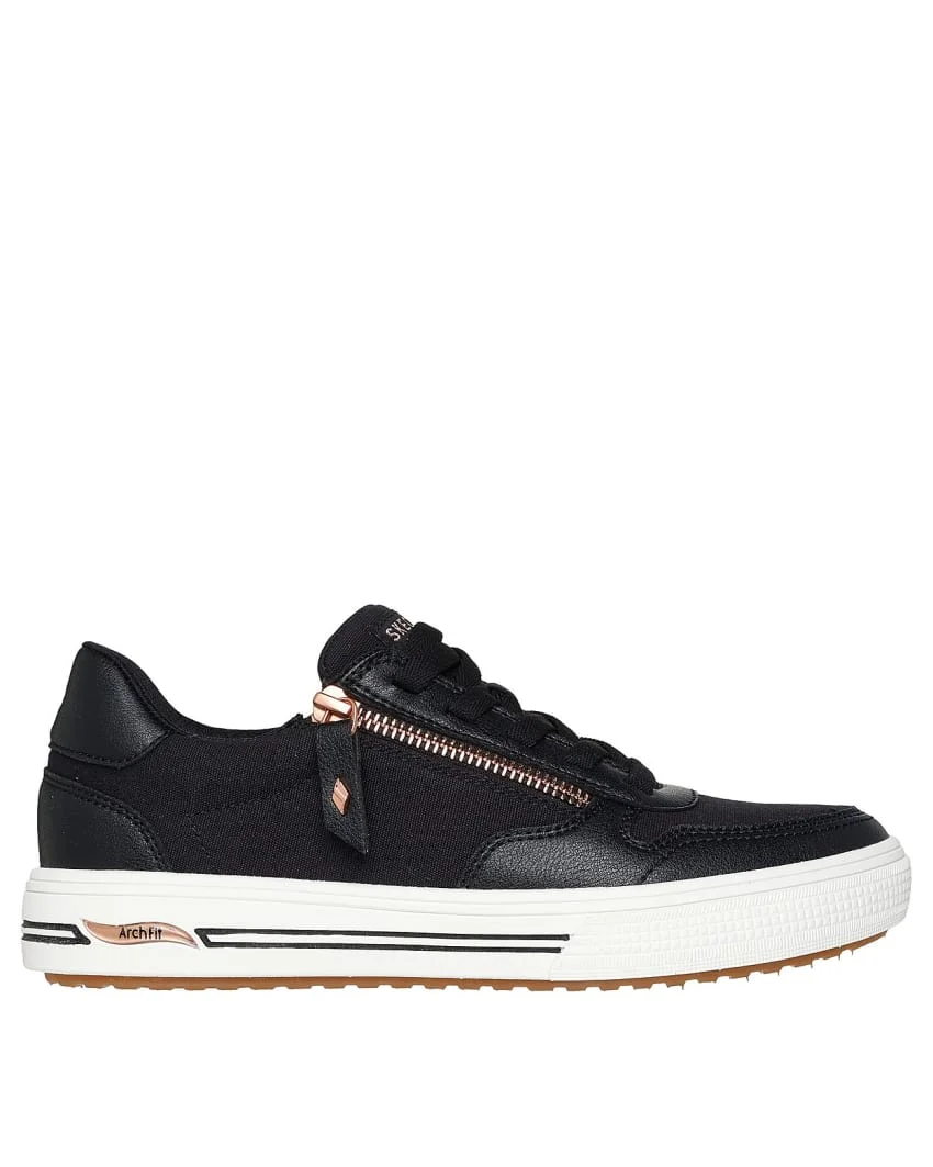 Timeless style and supportive comfort combine in Skechers Street™ Arch Fit® Arcade – On The Fly. This sneaker features a lace-up synthetic duraleather upper with canvas. Featuring a side zip closure and a removable Arch Fit® insole with Skechers Air-Cooled Memory Foam® technology.