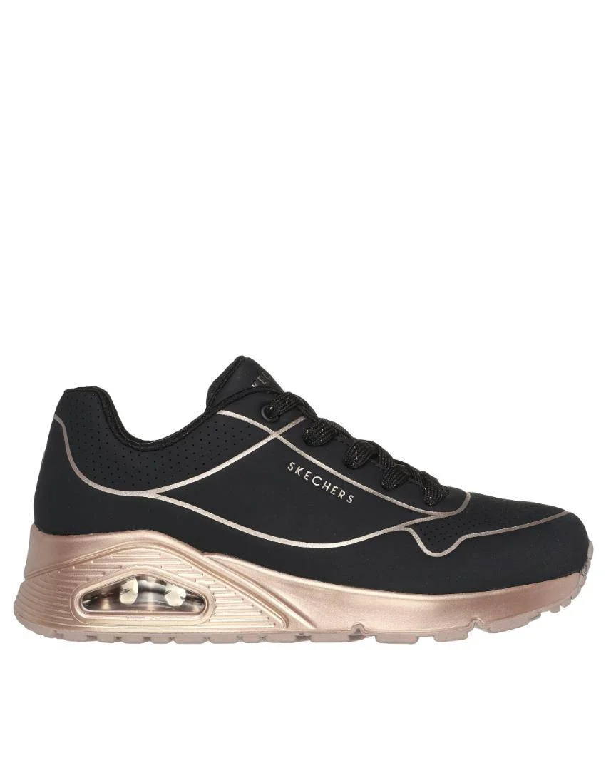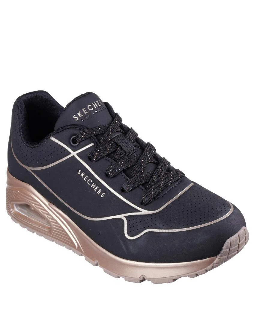 Shine on in fashionable comfort wearing Skechers Streetâ„¢ Uno – Cool Heels. This fabulous metallic trimmed sneaker features a lace-up synthetic durabuck upper with a Skech-Air® visible airbag midsole, and a Skechers Air-Cooled Memory Foam® insole.